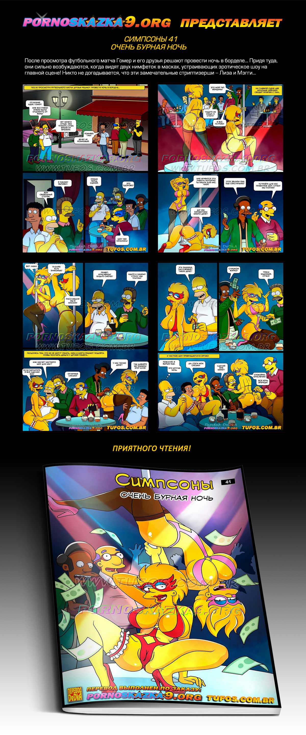 Порно комикс Симпсоны. Часть 41. Очень бурная ночь. После просмотра футбольного матча Гомер и его друзья решают провести ночь в борделе… Придя туда, они сильно возбуждаются, когда видят двух нимфеток в масках, устраивающих эротическое шоу на главной сцене! Никто не догадывается, что эти замечательные стриптизерши — Лиза и Мэгги…